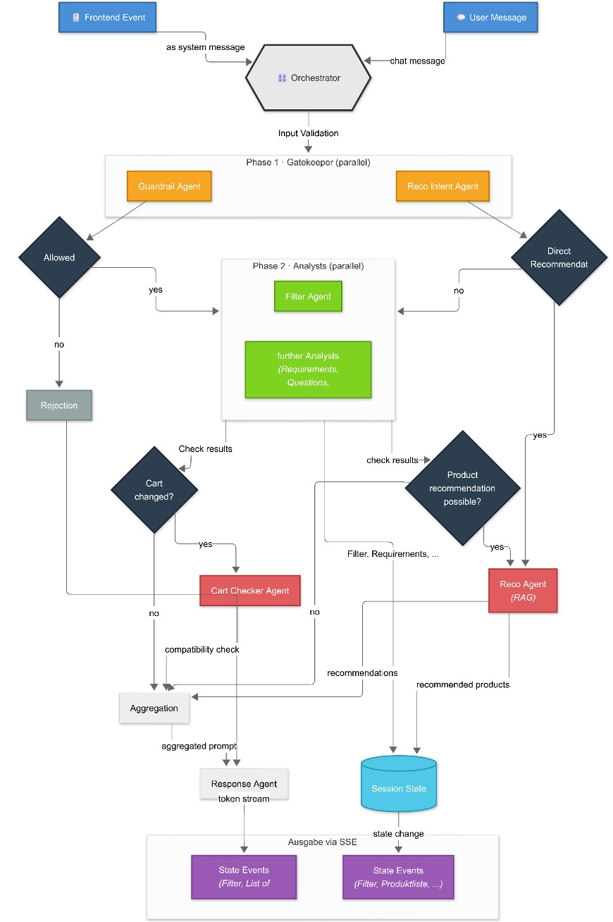 In addition, further analyst agents exist, e.g., for requirements, follow-up questions, knowledge-based answers, product attributes, or contradiction detection. They are activated depending on the context.